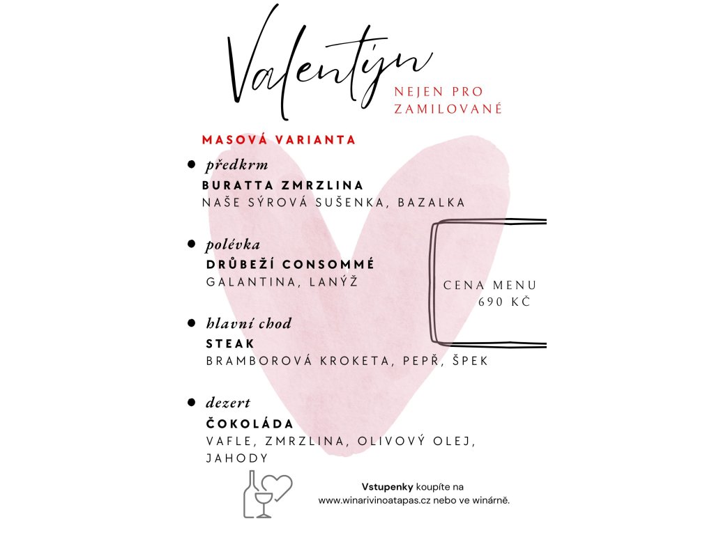 Ani tento rok vás neochudíme o Valentýn v plné parádě. Jen jsme si dovolili lehké změny a usnadnili vám rozhodování. Čeká na vás 4 chodové menu, kdy jediné, co musíte udělat, tak si vybrat, jestli si dáte masovou nebo rybí variantu.